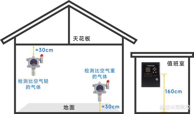 2.检测可燃气体比重小于空气时,可燃气体检测仪安装位置应该在疑似泄漏点上方,距离天花板不大于30-60cm,检测可燃气体比重大于空气时,可燃气体检测仪安装位置应该在疑似泄漏点下方30-60cm,距离地面不大于30cm;